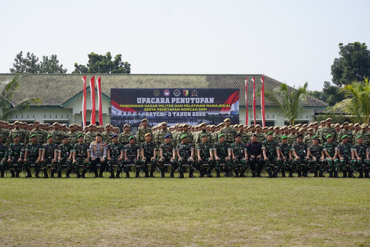 Malang,Teraskata.com – Pendidikan Dasar Militer dan Pelatihan Manajerial serta Penetapan Komponen Cadangan Strategi Penguatan Pertahanan Indonesia (SPPI) Batch-3 TA. 2025 secara resmi ditutup oleh Pangdam V/Brawijaya Mayjen TNI Rudy Saladin. Kegiatan penutupan yang dilaksanakan di Lapangan Dodik Belanegara Rindam V/Brw tersebut turut dihadiri Danrem 083/Bdj Kolonel Inf Kohir beserta jajaran TNI-Polri dan civitas Universitas Pertahanan RI.