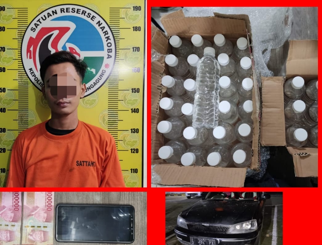 Dari tangan pelaku berinisial GF (28) asal Jl. Raya Jengles, Kelurahan Blabak, Kecamatan Pesantren, Kota Kediri, didapati barang bukti berupa miras jenis Arak Bali sebanyak 31 botol ukuran 600 ml.