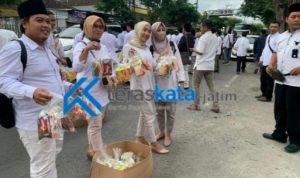 Tampak antusias Komisioner Bawaslu, Staf dan Panwascam membagikan ratusan paket takjil kepada pengguna jalan.