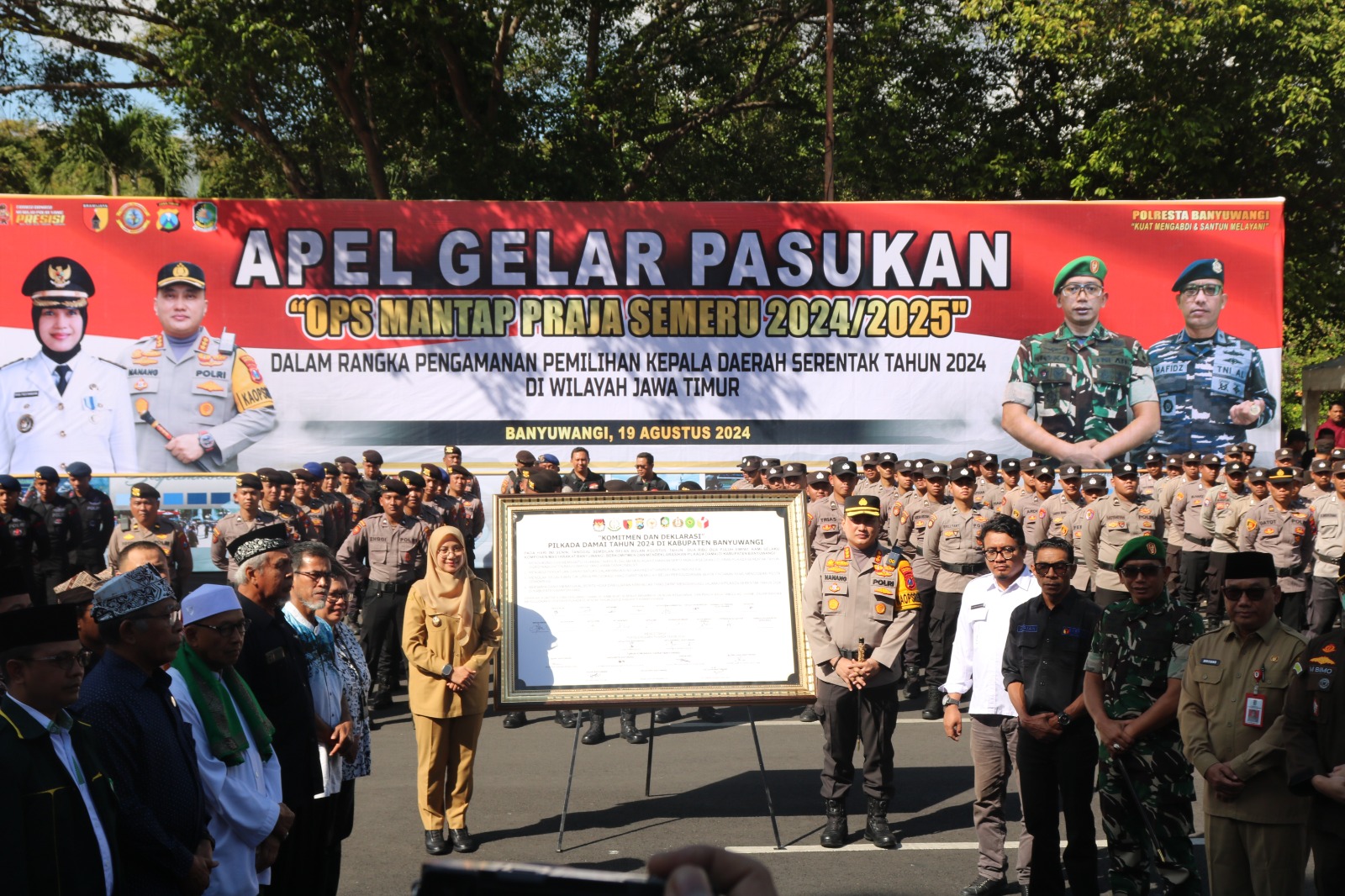 Kapolresta Banyuwangi Kombes Pol Nanang Haryono bersama Forkopimda hadiri Deklarasi Damai di depan Halaman Pendopo Banyuwangi.