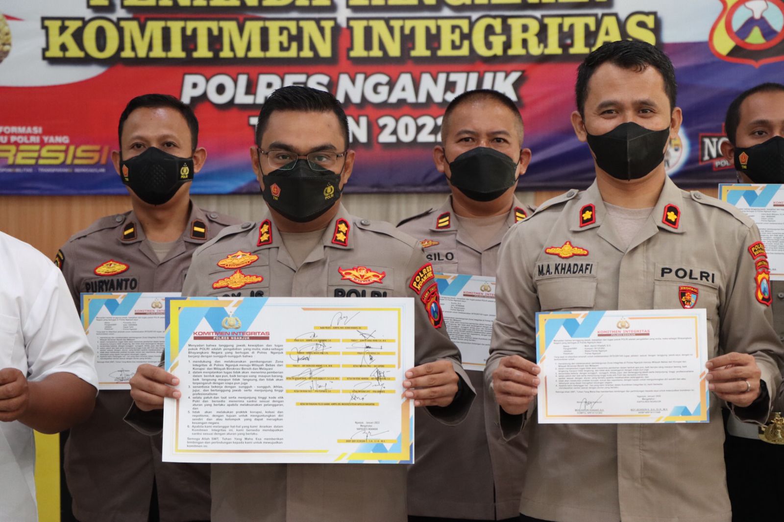 TERASKATA.Com, Nganjuk– Kapolres Nganjuk, AKBP Boy Jeckson, S.H.,S.I.K.,M.H. berharap Pakta Integritas yang ditandatangani oleh jajaran pimpinan Polres Nganjuk tidak menjadi seremonial semata. Hal itu disampaikan saat memimpin pelaksanaan penandatangan Pakta Integritas untuk pejabat Polri di lingkungan Polres Nganjuk, Rabu (26/1/2022).
