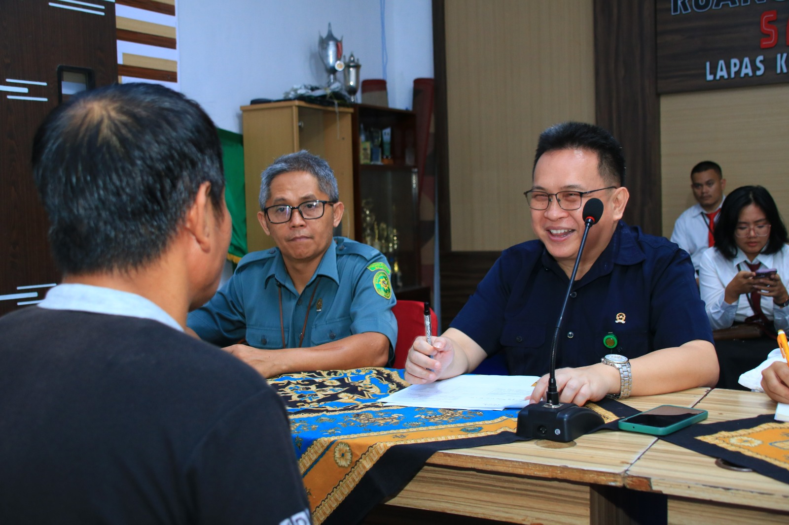 Agus Wahono selaku Kepala Lapas Kelas IIA Banyuwangi beserta jajaran menerima secara langsung Hakim WasMat PN BWI Philip beserta Tim yang terdiri dari 2 (dua) orang Panitera PN BWI dan 2 (dua) orang Klerek – Analis Perkara PN BWI. Giat tersebut dipusatkan di dalam Ruang Rapat Utama Aula Sahardjo Lapas Kelas IIA Banyuwangi.