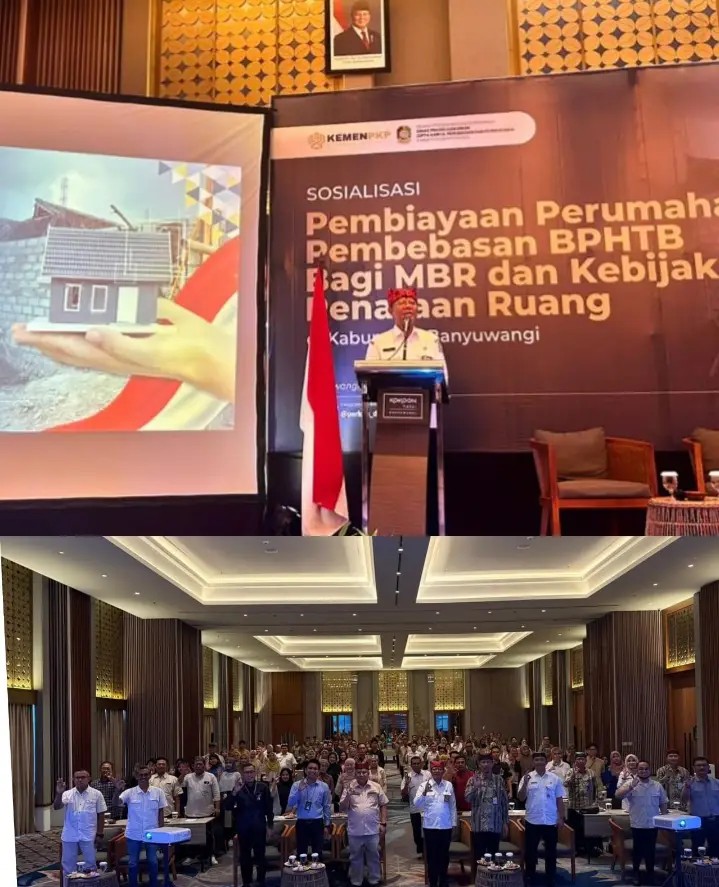 Banyuwangi,Teraskata.com – Pemerintah Kabupaten Banyuwangi melalui Dinas Pekerjaan Umum Cipta Karya, Perumahan dan Permukiman (PU CKPP) menggelar Sosialisasi Pembiayaan Perumahan dan Pembebasan BPHTB bagi Masyarakat Berpenghasilan Rendah (MBR) di Kokoon Hotel Banyuwangi, Dusun Krajan, Desa Dadapan, Kecamatan Kabat, pada Rabu (15 Oktober 2025).