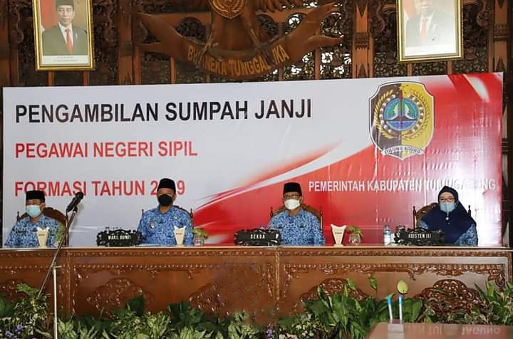 TERASKATA.Com,Tulungagung-Pemerintah Kabupaten Tulungagung melalui Badan Kepegawaian Pengembangan Sumber Daya Manusia Kabupaten Tulungagung melaksanakan Pengangkatan dan Pengambilan Sumpah Janji Calon Pegawai Negeri Sipil diangkat menjadi Pegawai Negeri Sipil Formasi Tahun 2019, di Pendopo Kongas Arum Kusumaning Bongso. Jum’at, (04/02/2022) pagi.