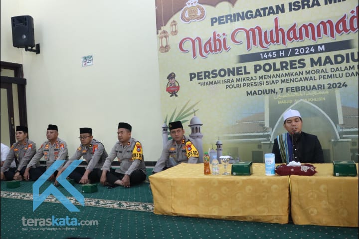 Madiun,Teraskata.com – Polres Madiun Kota menggelar peringatan Isra Mi’raj Nabi Muhammad SAW 1445 H sebagai bentuk penghayatan terhadap peristiwa penting dalam sejarah Islam dengan mengambil tema “Hikmah Isra Mi’raj menanamkan moral dalam mewujudkan Polri Presisi siap mengawal Pemilu damai”