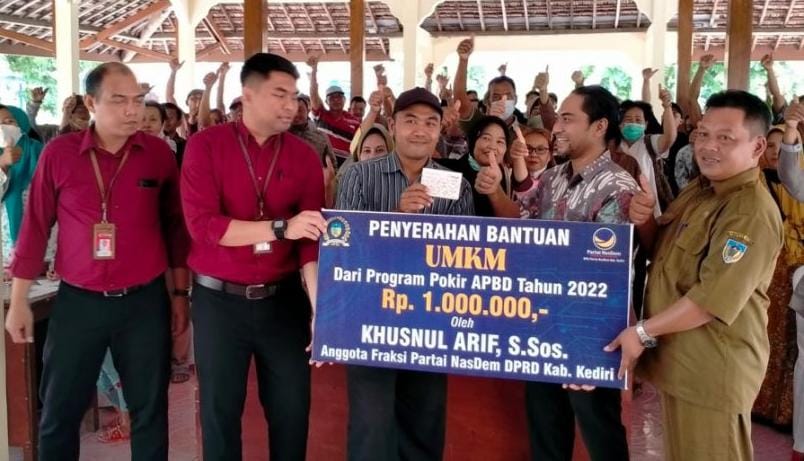 TERASKATA.Com, Kediri– Anggota DPRD Kabupaten Kediri, Khusnul Arif menyalurkan Bantuan Langsung Tunai (BLT) kepada 75 orang pelaku Usaha Mikro Kecil dan Menengah (UMKM), sebagai upaya mendorong pertumbuhan ekonomi masyarakat, Senin (5/9/2022).