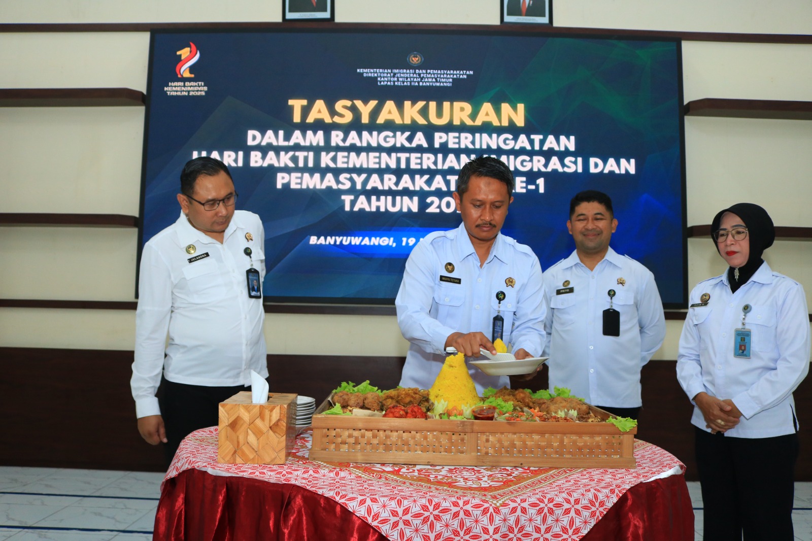 “Tasyakuran ini tidak hanya sekadar bentuk rasa syukur, tetapi juga untuk menyatukan hati dan pikiran seluruh insan Kemenimipas, khususnya di Lapas Banyuwangi. Dengan hati yang satu, kita berdoa dan berharap ke depan Kemenimipas dapat semakin memberikan kontribusi yang nyata dan bermakna bagi masyarakat,” ujarnya.