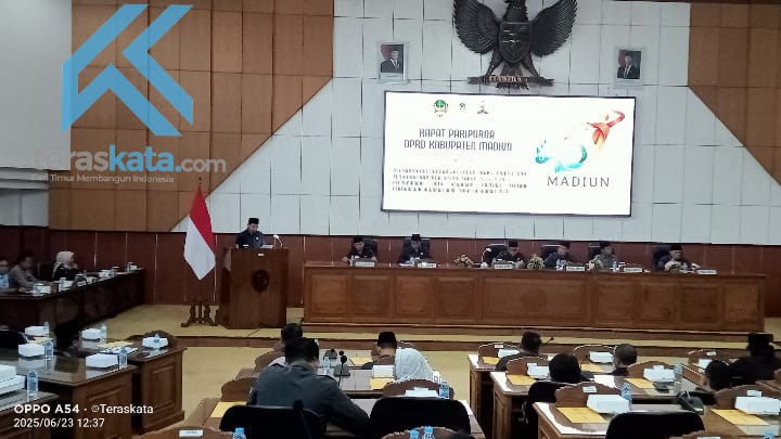 Madiun,Teraskata.com – Dewan Perwakilan Rakyat Daerah (DPRD) Kabupaten Madiun menggelar Rapat Paripurna dalam rangka penyampaian pandangan umum Fraksi-Fraksi DPRD atas penjelasan Bupati Madiun terhadap dua Rancangan Peraturan Daerah (Raperda), yakni Raperda tentang Rencana Pembangunan Jangka Menengah Daerah (RPJMD) Kabupaten Madiun Tahun 2025–2029, serta Raperda tentang Pertanggungjawaban Pelaksanaan Anggaran Pendapatan dan Belanja Daerah (APBD) Kabupaten Madiun Tahun Anggaran 2024.
