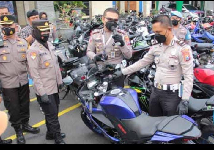 TERASKATA.Com, Kediri— Satlantas Polres Kediri Kota mengamankan 153 unit kendaraan roda dua. Ratusan motor tersebut terjaring razia karena membuat gaduh dengan knalpot brongnya. Operasi dilaksanakan oleh Satlantas Polres Kediri Kota sejak tanggal 5 hingga 13 Agustus 2022.