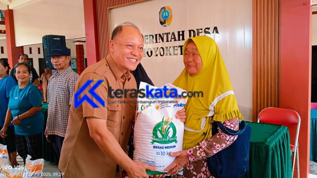 Tulungagung,Teraskata.com – Ratusan Warga desa Moyoketen, terima bantuan pangan dari Presiden RI Prabowo Subianto, yang diserahkan langsung secara simbolik oleh Bupati Tulungagung, bersama Kepala Dinas Ketahanan Pangan, dan Bulog Tulungagung, di Pendopo Desa Moyoketen, Kecamatan Boyolangu, Kabupaten Tulungagung. Selasa, (29/7/2025).
