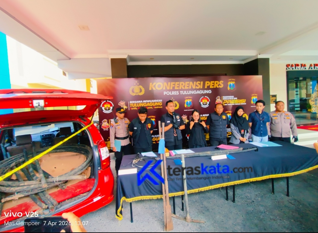 ”Tersangka AB berperan sebagai koordinator. Sembilan rekan lainnya memiliki tugas teknis yang spesifik, mulai dari menggali tanah, memotong kabel, hingga menarik kabel primer menggunakan mobil yang telah dimodifikasi,” ujar Ipda Fafa saat Konferensi Pers di halaman Mapolres Tulungagung. Selasa (07/04/2026).